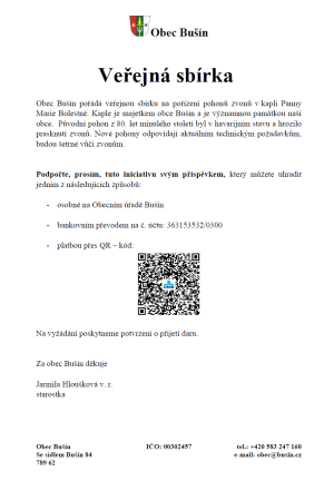 Obec Bušín pořádá veřejnou sbírku na pořízení pohonů zvonů v kapli Panny Marie Bolestné.